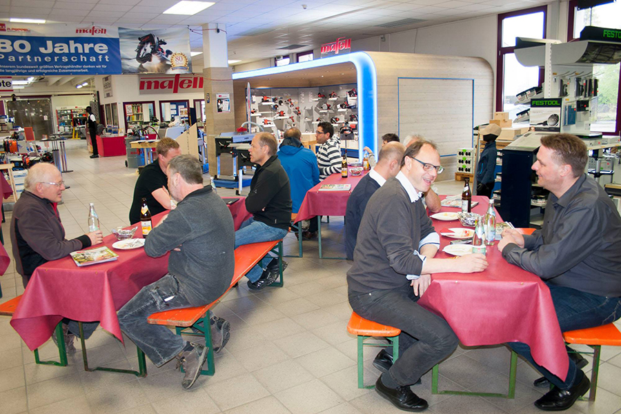 Am 27. April 2017 trafen sich Kunden und Interessenten mit MAFELL bei uns im Haus zur geselligen Eröffnung der neuen MAFELL Powershop-Ausstellung. Neben der Live-Vorführung der neuen MAFELL Dämmstoffsäge DSS300cc, welche mit ihrer sägeblattlosen Raffinesse begeistert, gab es auch reichlich fürs leibliche Wohl.